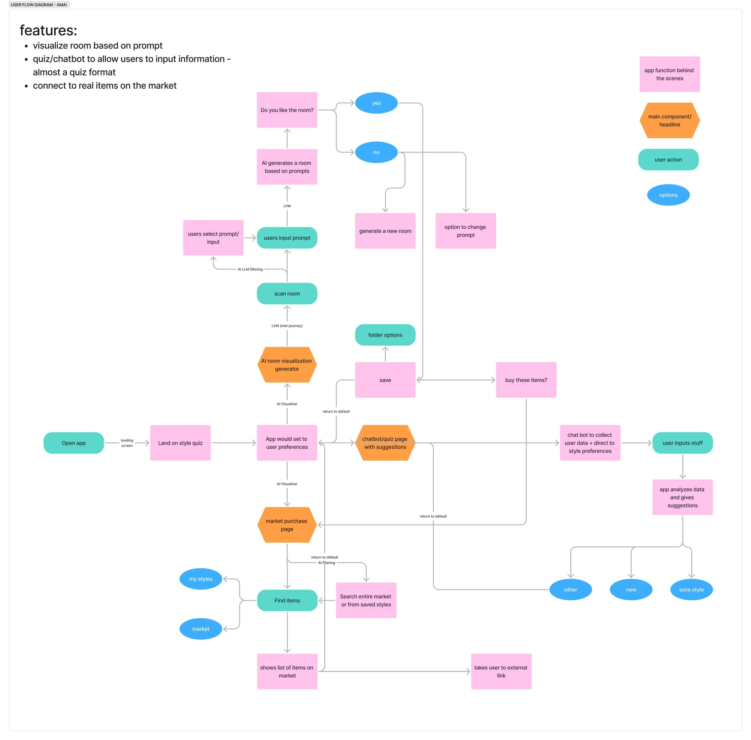 A user flow diagram helps to break down the research of the user needs, pain points, goals, and experience and create a detailed flow of each element of the app that will aim to solve different specific problems. This diagram shows the main functions of the app including the three central features to cover the umbrella of user needs; visualization, style ideation, and market connection.