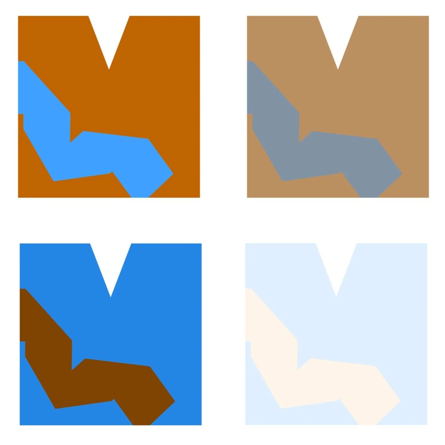 The same approach was utilized with a new letterform, and a translated shape from a folded piece of paper. Using these new forms, color was explored highlighting shades, tints, and tones of two complementary colors.