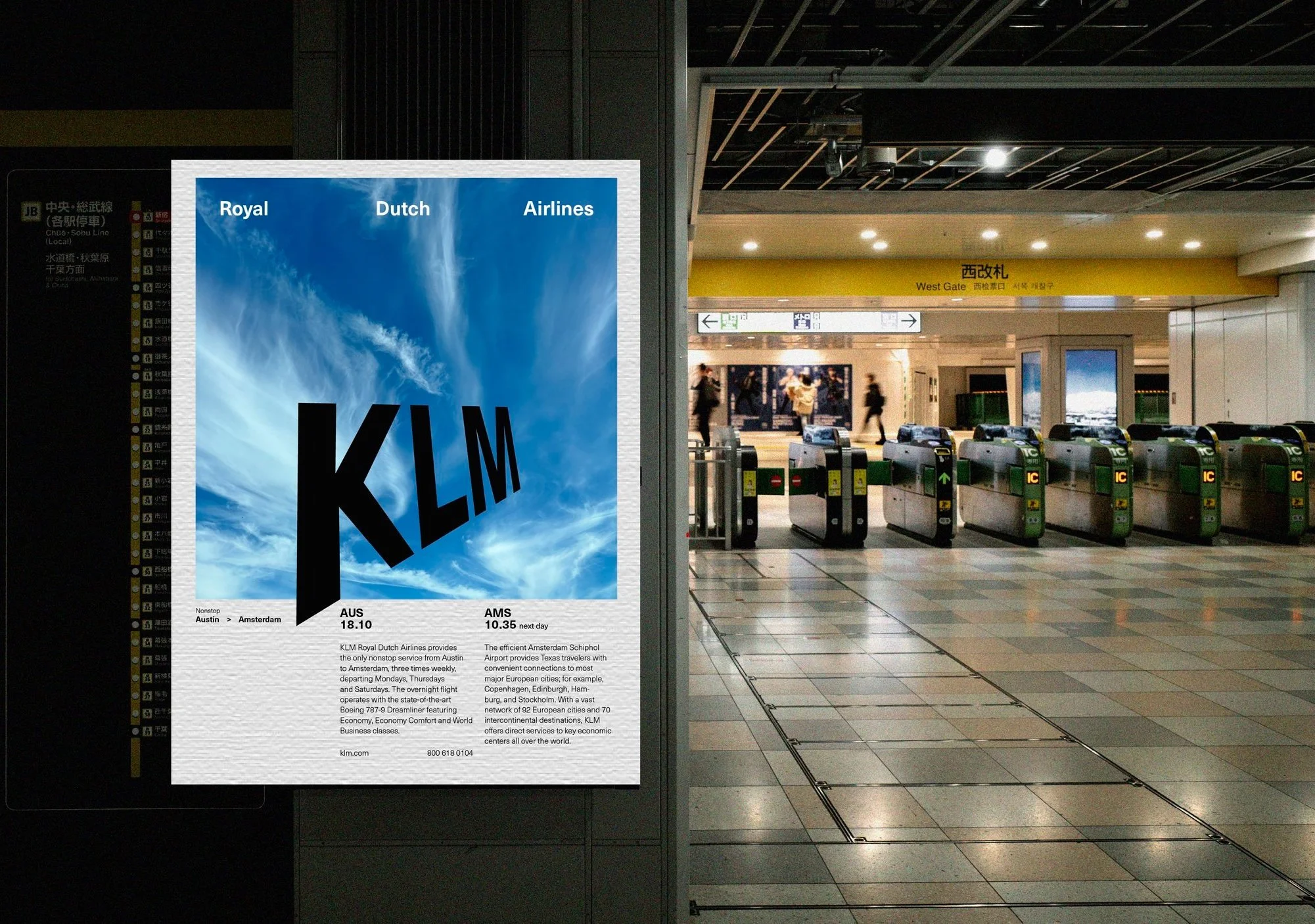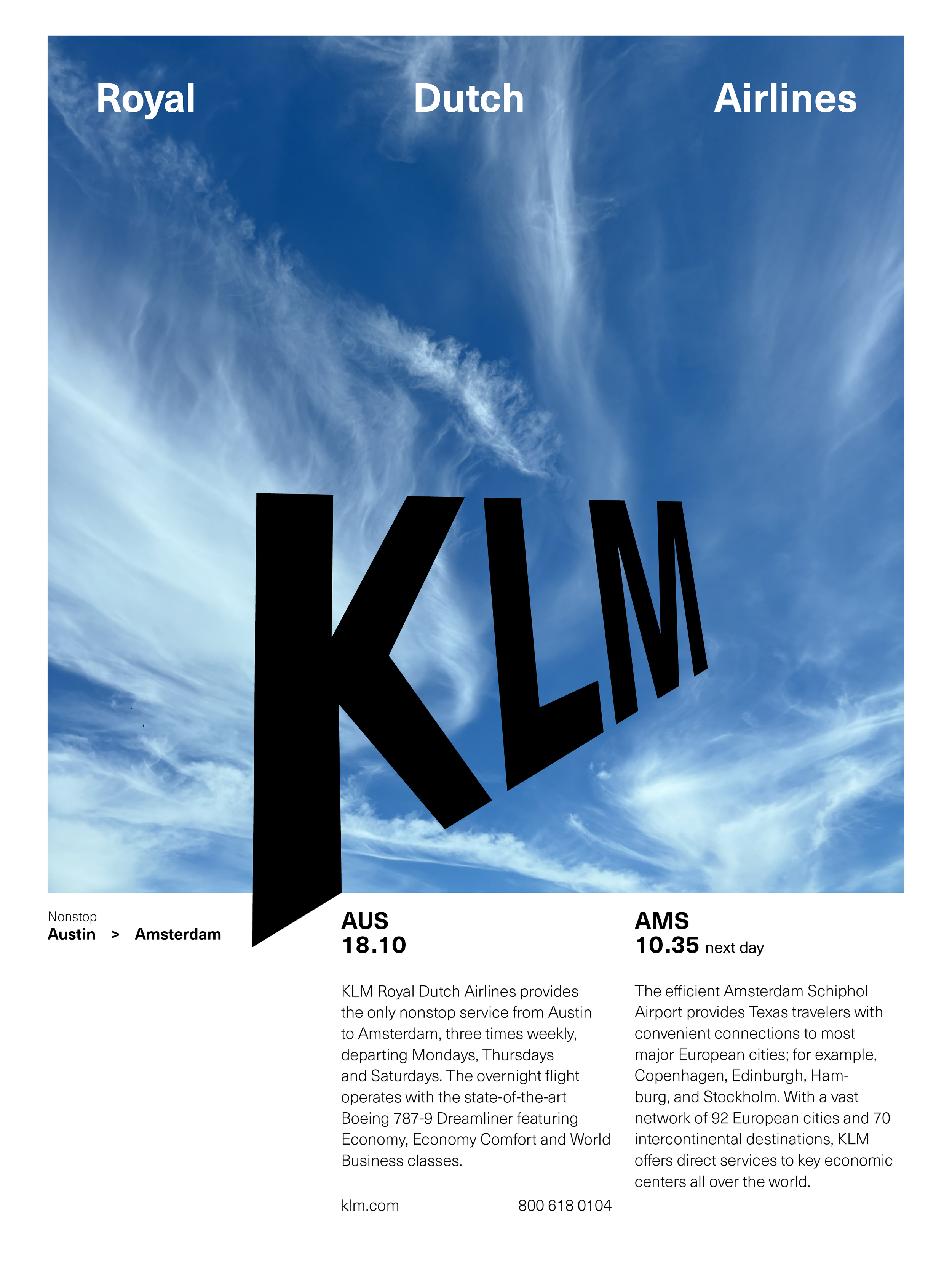 A flight from Austin to Amsterdam just opened and it needs some advertising posters. This airline requires a set of posters displaying the information, an advanced use of typography, and visual elements of flight. Each poster should be different from one another and utilize typography as an aid in communicating both the information and flight as a visual element.